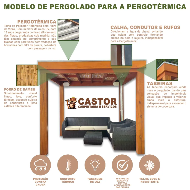 O modelo de Pergolado para a Pergotérmica necessita que tenha tabeiras, pois ela esconderá a cobertura. Dessa forma, as tabeiras encorpam ainda mais o pergolado, dando uma sensação de imponência visual que impacta e valoriza ainda mais a estrutura. O resultado fica incrível agregando o forro de Bambu.