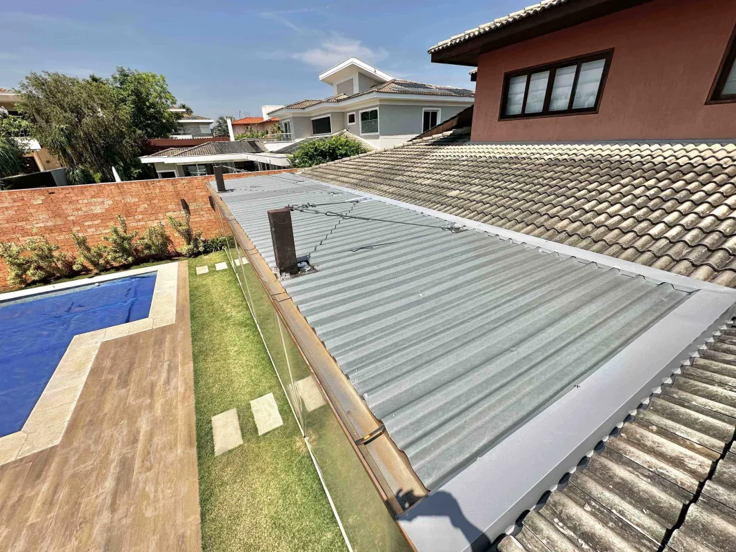 Telha de Poliéster Reforçado com Fibra de Vidro, Com inibidor de raios UV, com 10 anos de garantia contra o afloramento das fibras, produzidas sob medida, não têm emenda no comprimento e são fixadas com parafusos com vedação de borrachas com 98% de pureza, reduzindo ainda mais qualquer possibilidade de vazamento.